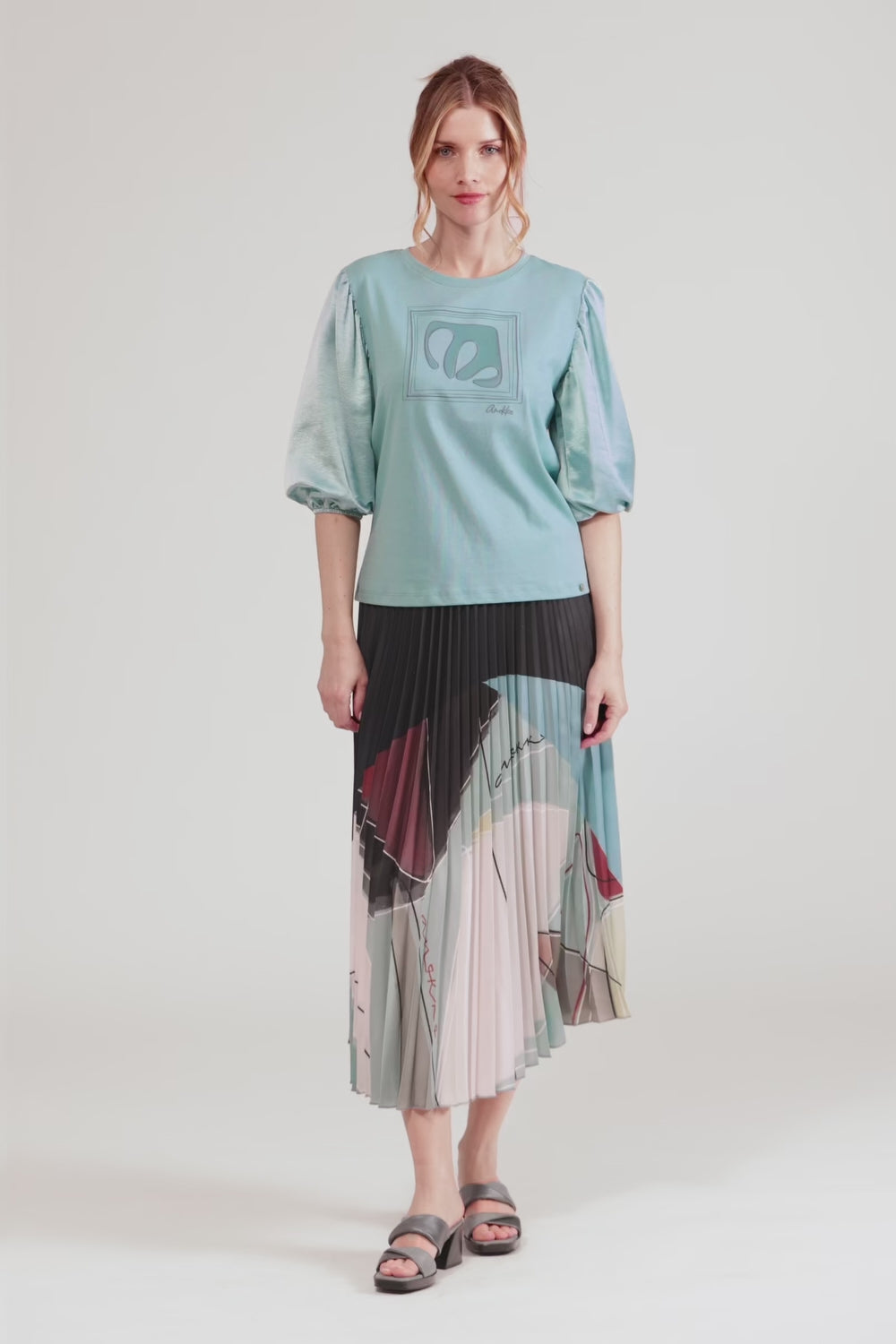 Esta falda plisada con estampado Auralis es una pieza que transforma cada paso en estilo. Sus pliegues crean un efecto de luz y sombra que realza el print, inspirado en el brillo interior y la conexión con tu esencia. Con caída fluida y cintura cómoda, es una prenda versátil que puedes combinar con básicos o con otras piezas de la colección para un look lleno de personalidad.